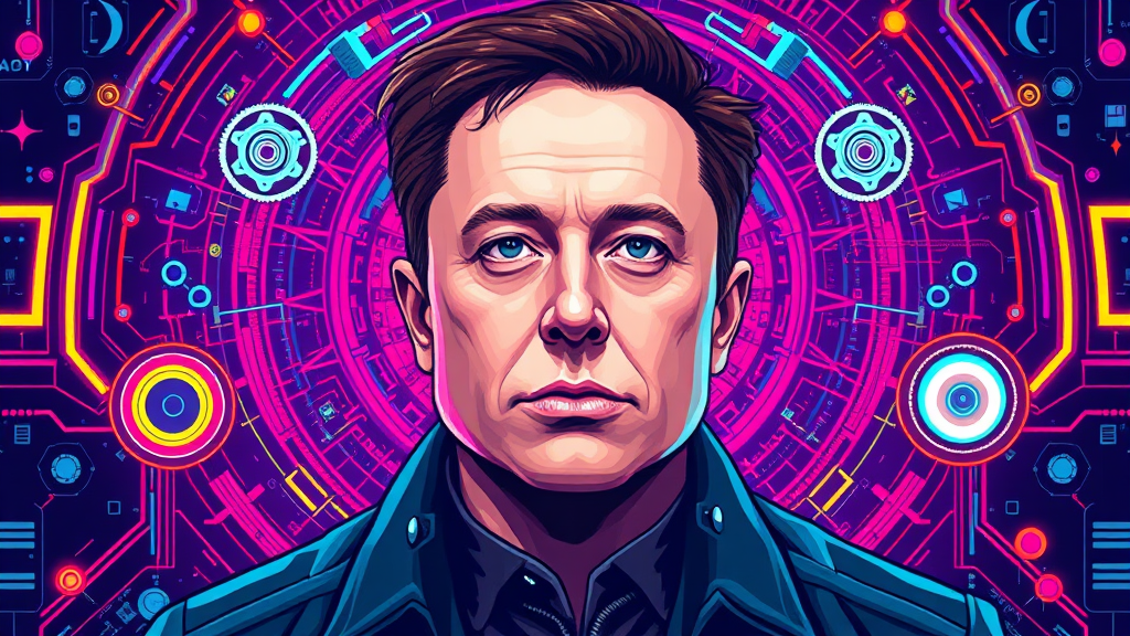 Elon Musk futuristic portrait in vibrant pixel art style, surrounded by innovative technology and colorful AI-inspired elements.