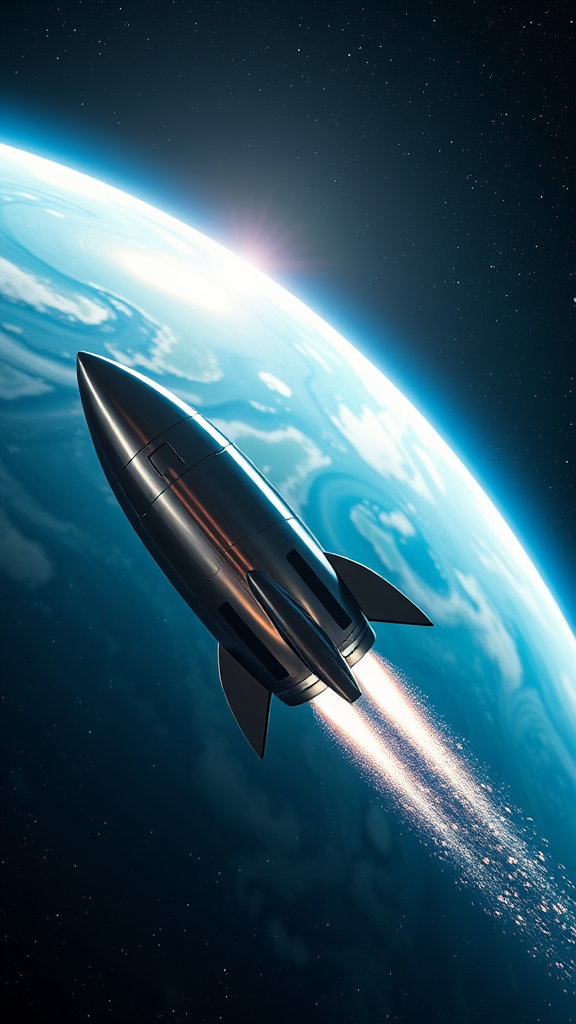 Elon Musk gracefully maneuvers a sleek, futuristic toy Rocketship through the vastness of space, its polished metallic surface glistening against the stars. Above him, a luminous Earth swirls with vibrant blues and greens, casting a gentle glow. As the cosmic winds playfully buffet the minimalistic craft, its minimalist design features an innovative propulsion system leaving a trail of iridescent stardust. The scene captures the awe of exploration, with Elon effortlessly piloting, embodying both the childlike wonder of discovery and the pioneering spirit of human innovation.