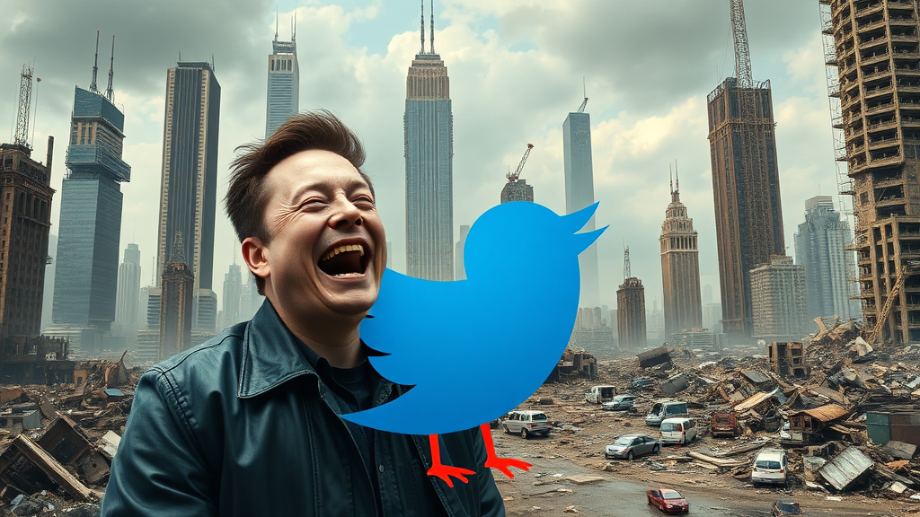 Elon Musk in a fit of hysterical laughter beside a vibrant blue Twitter bird, surrounded by a post-apocalyptic scene with ruins of towering buildings in disarray, captured in photorealistic style, conveying a surreal atmosphere with hints of dark humor and resilience amidst chaos.