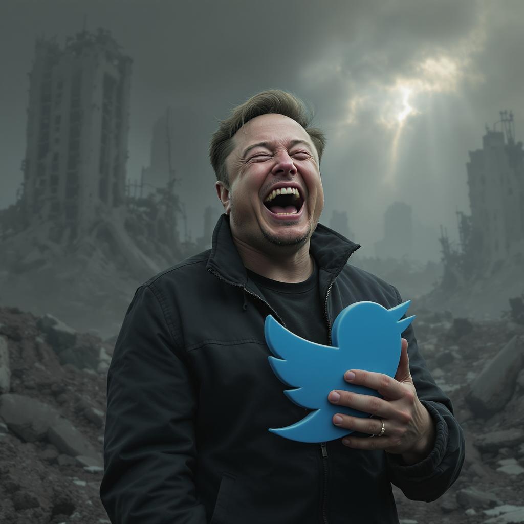 Elon Musk in a fit of hysterical laughter, clutching a vibrant blue Twitter bird amidst a post-apocalyptic landscape, with crumbling skyscrapers and debris strewn across the ground, captured in photorealistic detail, muted colors emphasizing the desolation, a faint glimmer of sunlight breaking through the clouds, creating an eerie yet mesmerizing contrast.