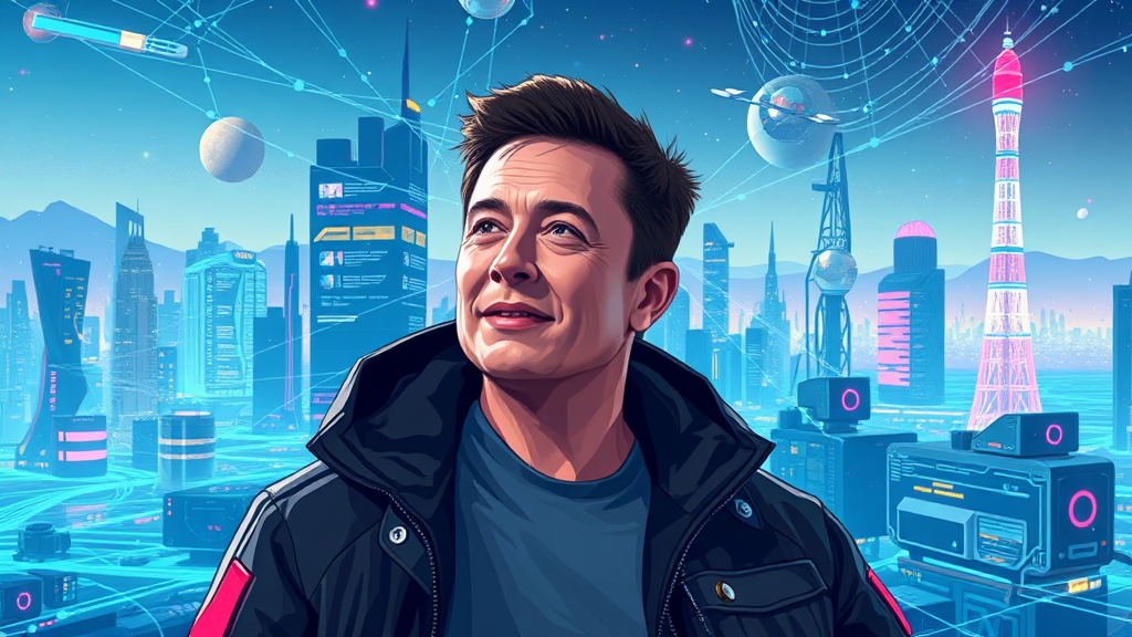 Elon Musk in a futuristic landscape, rendered in SAI Pixel Art style, surrounded by innovative technology and space elements, with a digital skyline in the background, showcasing interconnected networks and neon circuits.