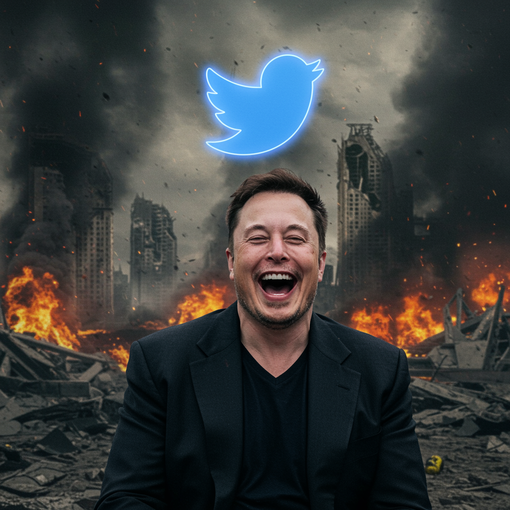 Elon Musk in fits of hysterical laughter alongside a glowing blue Twitter bird, set against a dystopian backdrop of crumbling skyscrapers and smoldering ruins, captured in photorealistic detail, emphasizing a 3:2 aspect ratio with version 5 enhancements.