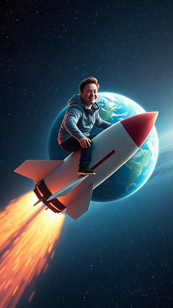 Elon Musk perched atop a sleek, minimalist toy Rocketship gliding effortlessly through the cosmos, stars glittering around him, with the vibrant blue planet Earth as a magnificent backdrop, his expression a blend of childlike wonder and adventurous spirit as he navigates the endless expanse of space.