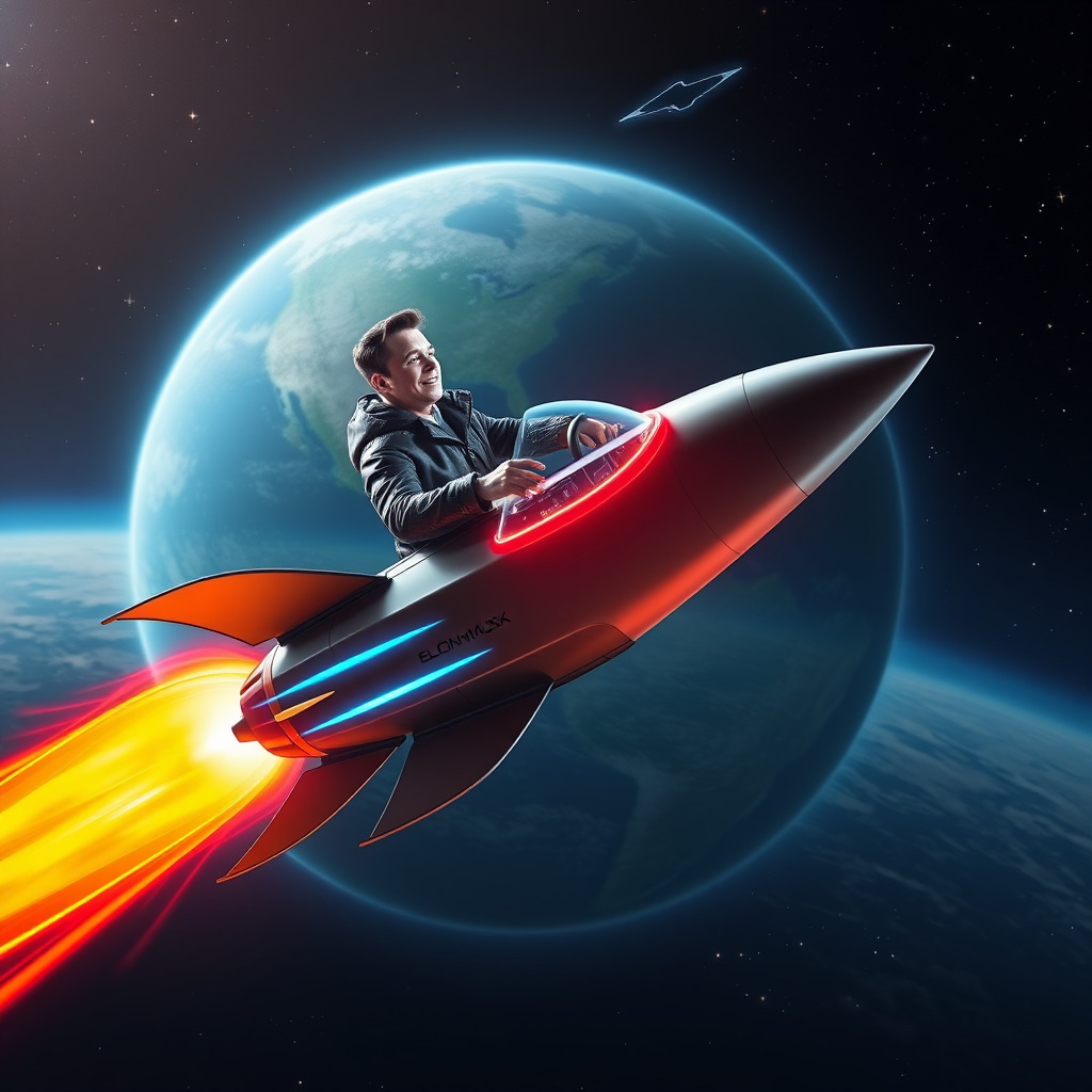 Elon Musk piloting a sleek, futuristic toy rocketship through the vast expanse of space, with the curvature of Earth visible in the background, stars twinkling around him, and the rocketship adorned with vibrant neon trails that illuminate the cosmos, adding a sense of wonder and excitement to the scene.