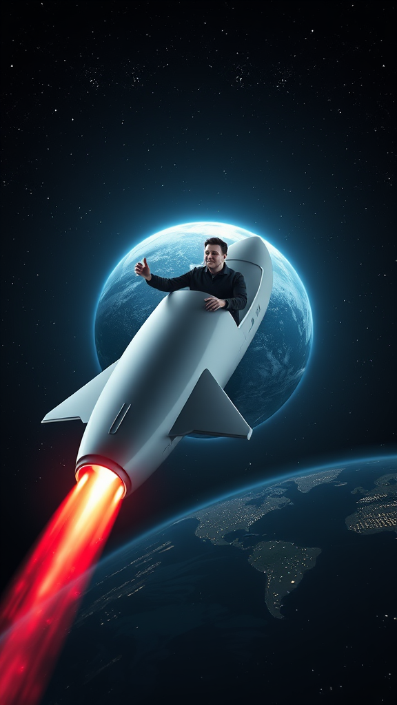 Elon Musk piloting a sleek, minimalist rocket-shaped spaceship through the vast expanse of space, his figure framed by the curvature of Earth glowing gently behind him, with twinkling stars scattered across the dark sky, a trail of vibrant cosmic dust follows the vessel, highlighting its smooth metallic finish, while futuristic city lights on Earth hint at advanced civilizations below.