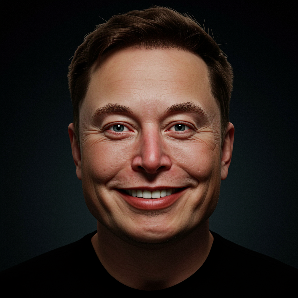 Elon Musk portrayed with deeply defined facial expressions, featuring vividly bright and realistic eyes, and a wide, charismatic grin that borders on maniacal. Exemplifying a masterpiece quality with refined studio lighting that casts dramatic shadows, adding depth and dimension. The atmosphere is slightly dark, enhancing the intensity and intrigue of the scene.