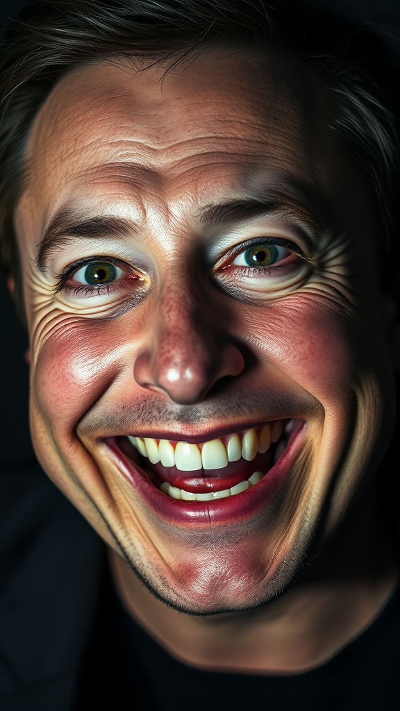 Elon Musk portrayed with intense skindentation, vividly bright and lifelike eyes, and an enormous, playful grin, captured as a masterpiece under expert studio lighting. The atmosphere is shadowy yet captivating, revealing subtle creative nuances that enhance the core concept of a dynamic and influential figure.
