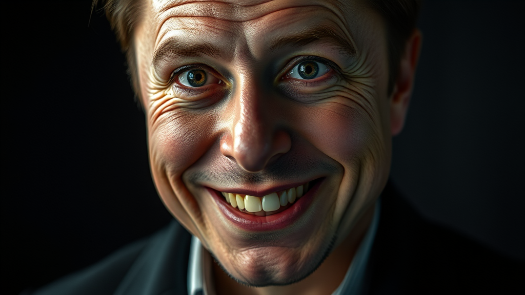 Elon Musk portrayed with strikingly realistic, bright eyes and a wide, mischievous grin, his skin meticulously detailed to highlight texture under exquisite studio lighting; a masterful composition capturing the essence of eccentric genius in a shadowy, enigmatic environment.