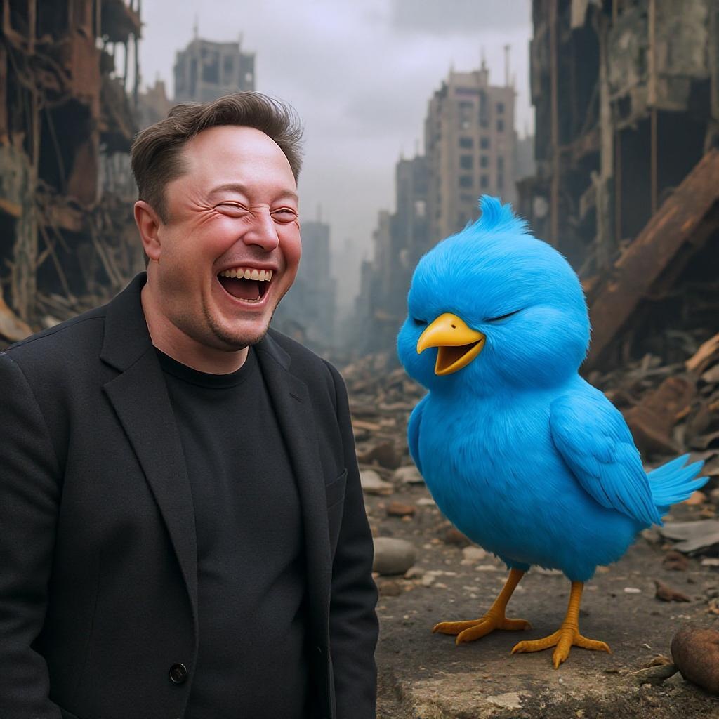 Elon Musk stands laughing hysterically alongside a vibrant blue Twitter bird, set against a post-apocalyptic landscape of crumbling skyscrapers and rusted ruins, captured in stunning photorealism, with a slightly exaggerated perspective to emphasize the surreal juxtaposition of the scene.