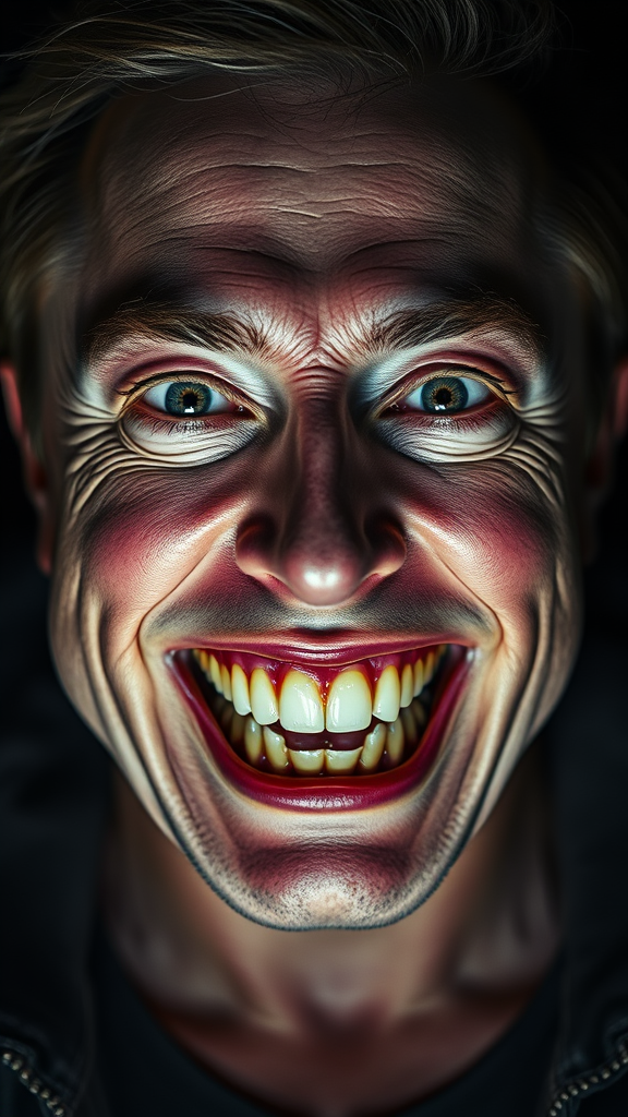 Elon Musk with skin deeply indented, eyes shining brightly with realism and a colossal, maniacal grin, capturing the essence of a masterpiece, illuminated by studio lighting, surrounded by an aura of mystery in a dark setting.