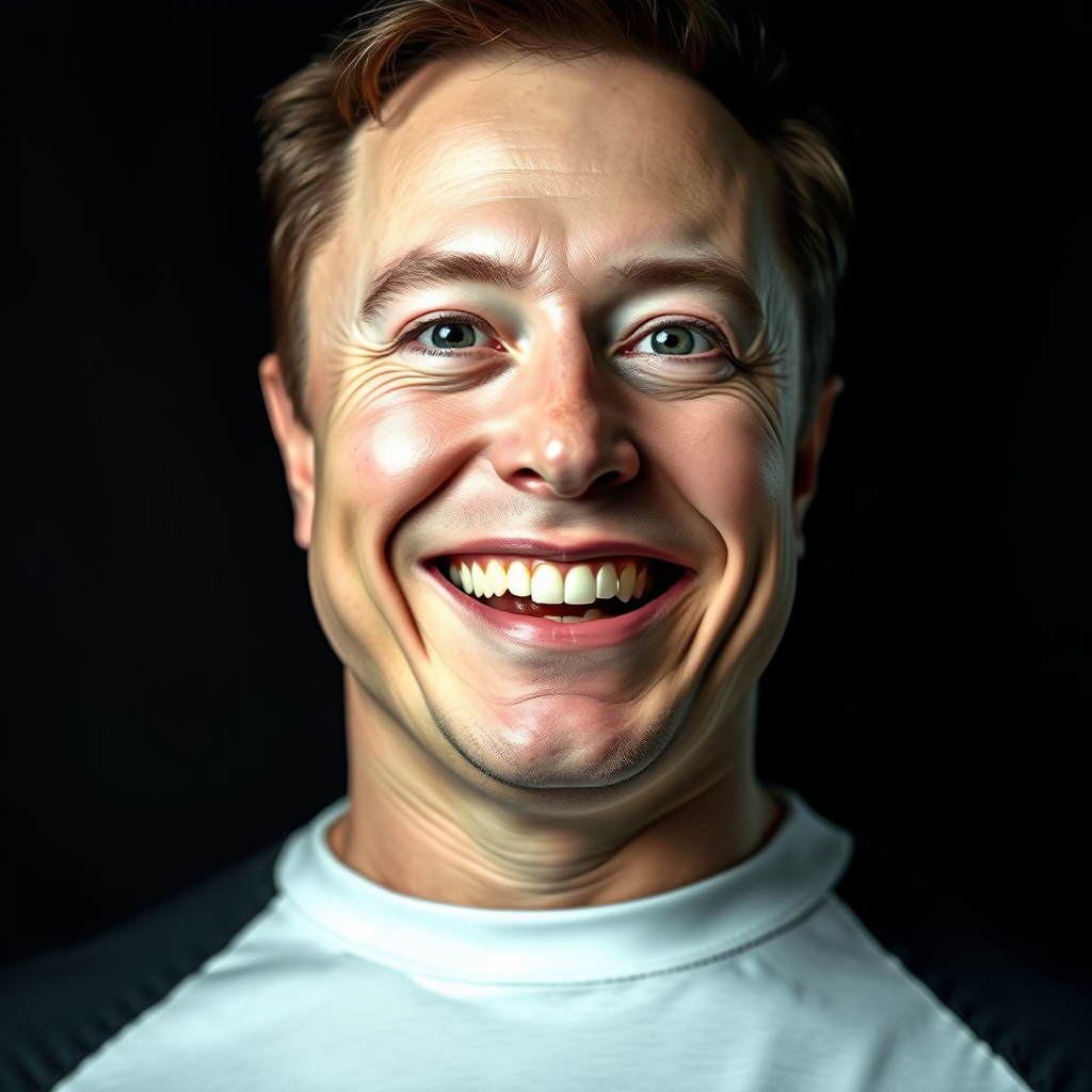 Elon Musk with smooth skin and distinct features, bright and lifelike eyes, wearing a wide, enthusiastic grin, captured in a masterpiece-style portrait under studio lighting, balanced with a slightly dark and edgy atmosphere, enhanced by subtle adjustments to emphasize realism and depth.
