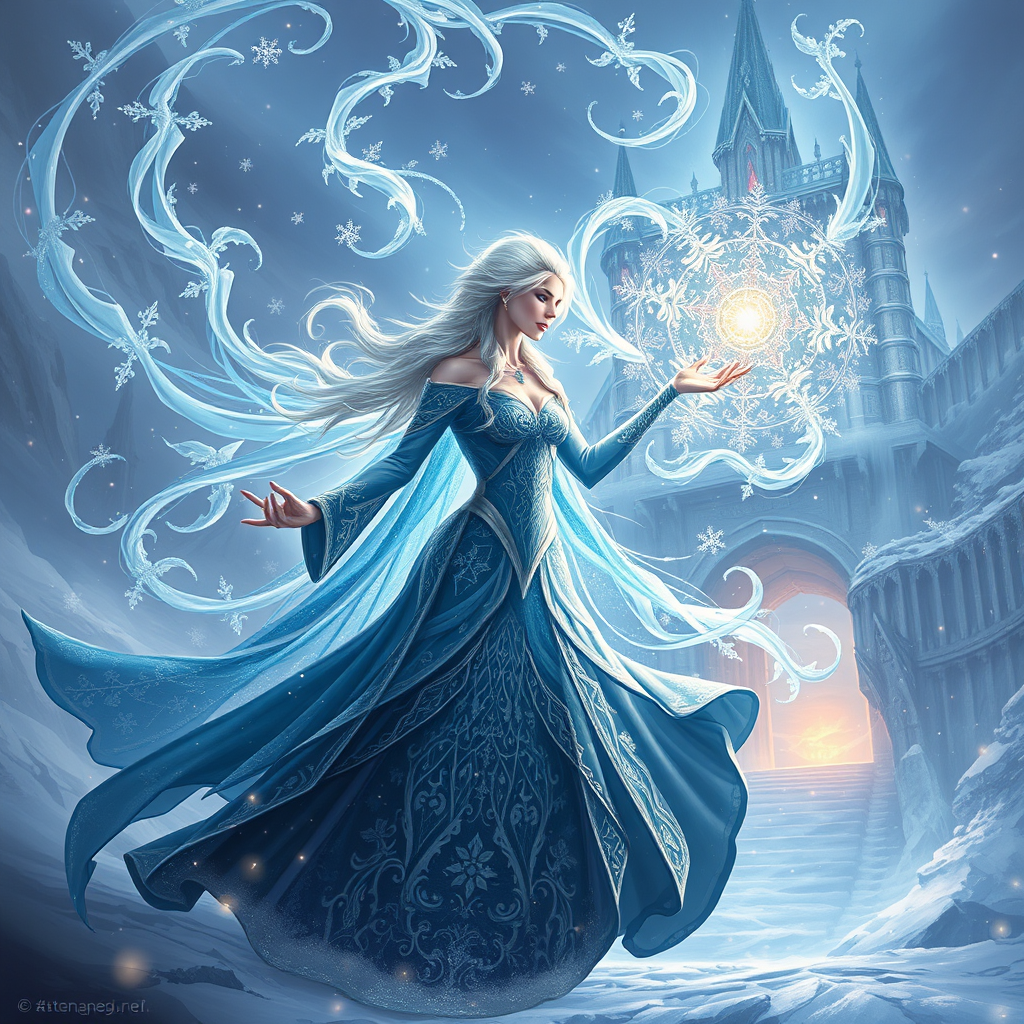 Elsa dungeons and dragons fantasy intricate elegant highly detailed digital painting artstation concept art matte sharp focus illustration hearthstone art by artgerm greg rutkowski alphonse mucha 8k easynegative ng_deepnegative_v1_75t enchanted icy sorceress surrounded by swirling snowflakes and shimmering ice crystals her gown reflects both regal elegance and warrior strength intricate patterns in cerulean and silver highlight a mystical aura around her casting a protective enchanted circle elegant icy palace in background