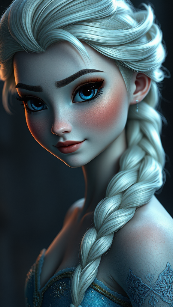 Elsa from Frozen in a hyper realistic style, featuring intricate details and sharp focus, emphasizing the highest quality and professional photography standards. Captured in hard, foreboding light from a dynamic angle, showcasing her perfect, full-body proportions. Her skin exhibits a highly detailed texture, complementing her beautiful, expressive face and eyes. The scene is set in muted tones, evoking a sense of realism and hyperrealism in UHD, 16k, HDR quality, while maintaining the core essence of Elsa's character.