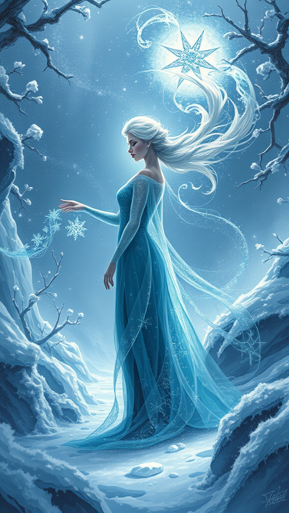 Elsa in a mystical D&D fantasy realm, depicted with intricate elegance and highly detailed digital painting style, akin to ArtStation concept art. She stands amidst an enchanting, frosted landscape, her icy powers swirling gracefully around her. The art captures a matte finish with sharp focus, reminiscent of the captivating illustrations found in Hearthstone. Influenced by the stylings of Artgerm, Greg Rutkowski, and Alphonse Mucha, the composition embodies the fluidity and ornate designs of Mucha's work blended with Rutkowski's rich textures and Artgerm's dynamic character portrayal. The image is rendered in stunning 8k resolution, retaining qualities from ng_deepnegative_v1_75t and bad-picture-chill-75v, accentuating a magical yet serene atmosphere.