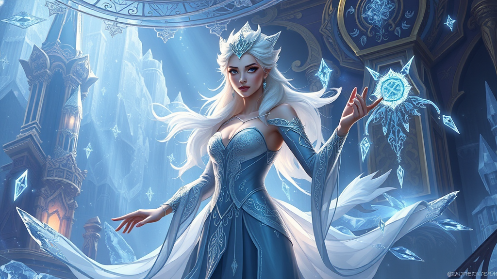 Elsa-inspired sorceress, majestic fantasy realm, intricate gowns, elegant icy motifs, highly detailed digital painting, immersive realm, concept art masterpiece, ethereal lighting, sharp focus illustration, echoing the style of Hearthstone, influenced by artists like Artgerm, Greg Rutkowski, and Alphonse Mucha, rendered in 8k resolution, enchanting ambiance, fine art texture, ethereal and enchanting aesthetic, shimmering ice crystals, sophisticated magical aura, serene and commanding presence.