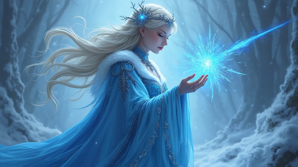 Elsa-inspired sorceress, set in a Dungeons & Dragons fantasy realm, portraying an intricate and elegant design, highly detailed digital painting reminiscent of ArtStation concept art. The piece showcases a matte finish with sharp focus, illustrating a scene emblematic of Hearthstone card art. Influenced by the styles of Artgerm, Greg Rutkowski, and Alphonse Mucha, it features rich HDR 4K, 8K resolution with subtle creative enhancements while retaining the core essence of a mythical ice queen.