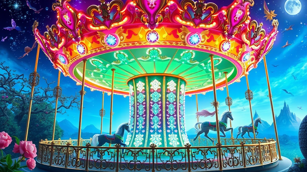 Embark on a dazzling journey aboard an enchanted merry-go-round, where each spin transports you to fantastical realms filled with shimmering creatures and vibrant landscapes.