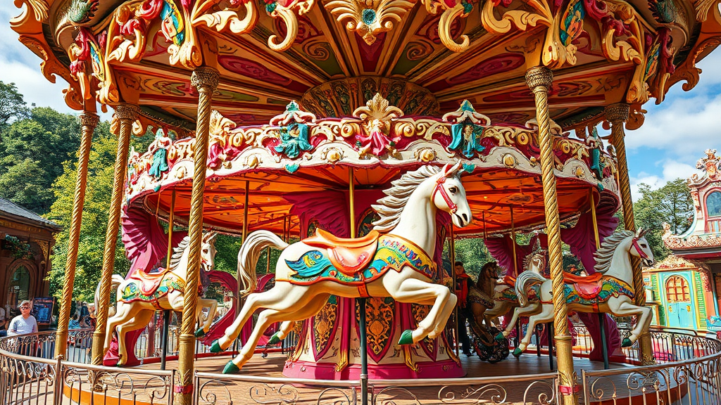 Embark on an enchanting journey atop a wondrous, mystical carousel, where each exquisitely carved creature springs to life, carrying you through vibrant realms of swirling colors and whimsical landscapes beyond imagination.