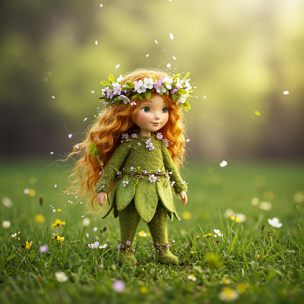 A whimsical embodiment of springtime emerges, exuding a sense of renewal and vitality. A gentle figure adorned with a crown of blossoms, their hair cascading like a waterfall of vibrant petals. Their attire is woven from the softest greens, echoing the tender buds and fresh leaves of the season. In their presence, the air fills with the fragrance of blooming flowers and the gentle hum of awakening nature. Their footsteps leave trails of sprouting grass and tiny blossoms, symbolizing the birth of new beginnings and the promise of warm days ahead. The scene is imbued with an ethereal glow, as if the sunlight itself is drawn to this personification of rejuvenation and growth.