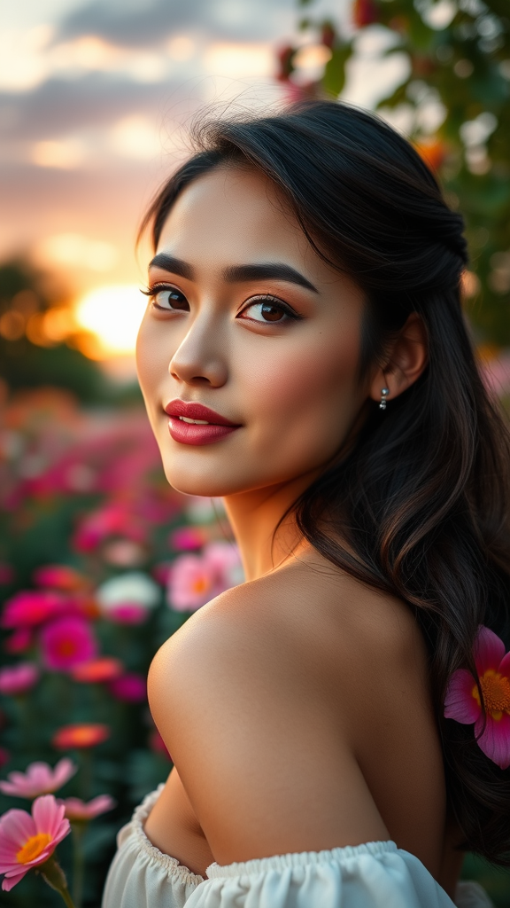Embrace the beauty of a professional morning photoshoot in a vibrant flower garden, where the model poses gracefully against a backdrop of a stunning morning sky. The atmosphere is captured in high-resolution, 8K clarity with HDR effects, highlighting the scene's vivid colors and soft, dreamy bokeh created by the blurry background. Every detail of the model's appearance is meticulously focused on, including the radiant and detailed skin, a face of striking beauty with clear, captivating eyes, and intricately defined eye pupils. Enhancing her natural allure, the model sports a subtle lipgloss and soft blush on her cheeks, complemented by delicate small earrings. The overall scene exudes a harmonious blend of sharp, professional photography while retaining an inviting, natural elegance. Any artistic influences are subtly integrated to maintain focus on the realism and high quality of the imagery.