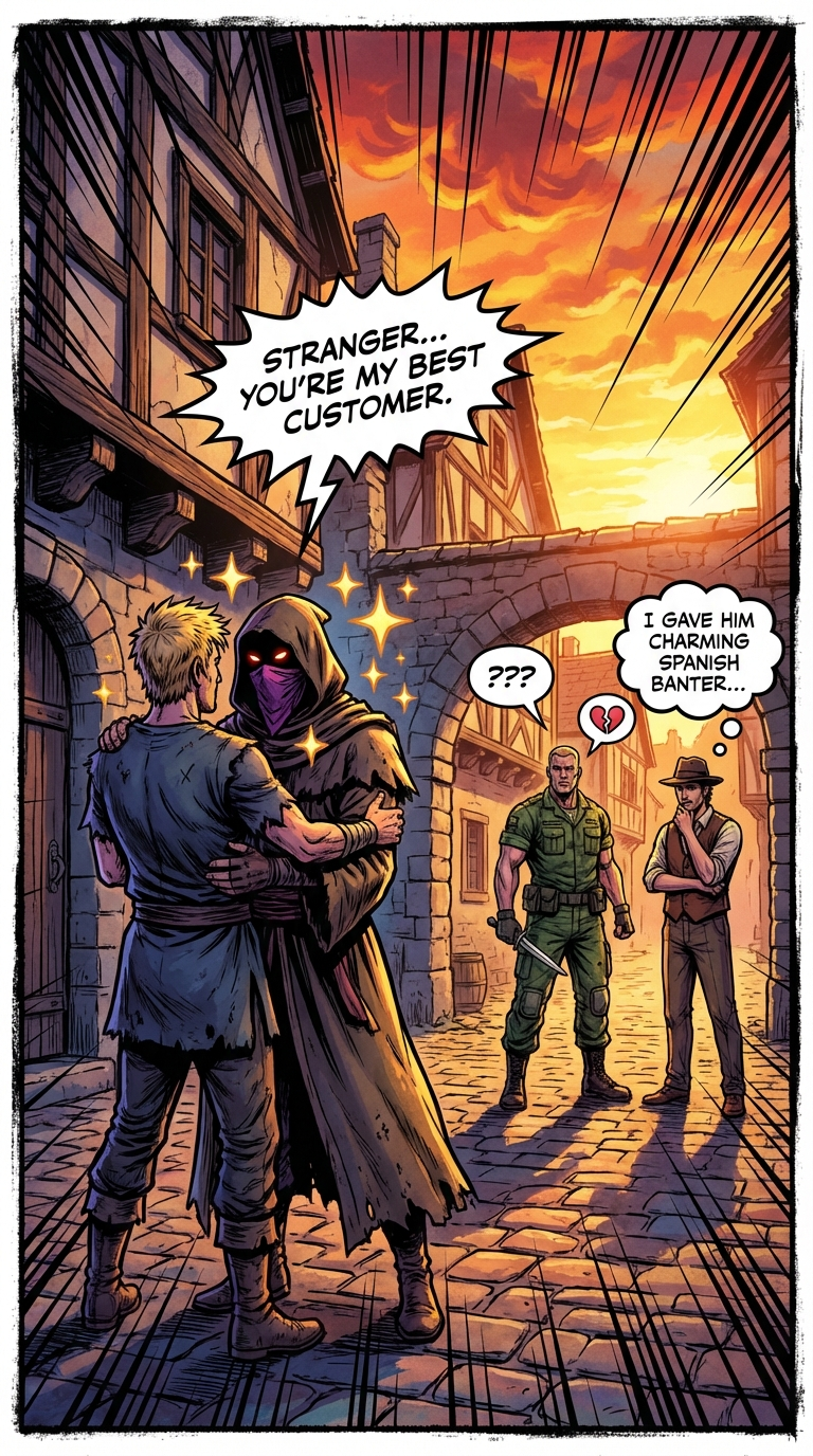 Comic book art style, a dramatic scene in a medieval European village street at sunset. In the foreground, two male figures embrace, one with spiky blonde hair and a dark blue shirt, the other a hooded figure with a purple bandana covering their face and glowing red eyes. They are surrounded by sparkling stars. Behind them, two other male figures react: one muscular man in military fatigues holding a knife, with a thought bubble showing "???", and a broken heart; and another man in a vest and fedora with a thought bubble saying "I gave him charming Spanish banter...". The hooded figure has a speech bubble saying "Stranger... you're my best customer." The background features old stone buildings and a dramatic orange and yellow sunset. The lighting is golden and warm on the right, contrasting with darker, cooler tones on the left. The mood is a mix of romance, jealousy, and humor. Dynamic lines radiate from the top and sides, emphasizing movement and comic book aesthetics.