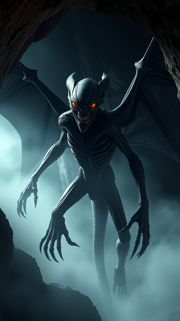 Emerging from the dense, swirling fog of a shadowy cave, a menacing alien creature unfolds its bat-like wings, revealing a black, hairy torso and elongated limbs ending in vicious, razor-sharp claws. Its grotesque face, twisted in perpetual hunger, sports a predator's mouth filled with jagged teeth. Its deadly glowing orange eyes pierce through the darkness, casting an ominous light. The creature's intricate design is highlighted by dramatic, cinematic lighting that accentuates every terrifying detail, rendering a photorealistic and cinematic scene with subtle noise, captured in stunning 8k resolution.