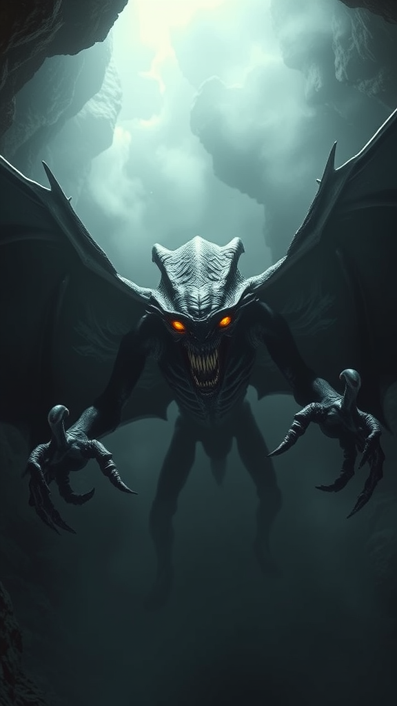 Emerging from the murky shadows of a fog-laden cavern, an ominous alien figure looms with immense bat-like wings stretching widely. Its black, bristly torso is contrasted by elongated limbs ending in talon-like claws that scrape ominously against the stone. The grotesque visage features a gaping predator's maw filled with serrated teeth, while its piercing orange eyes glow with a deadly intensity. The chilling scene is set in a world of horror, marked by complex detail and artistry, captured under dramatic, moody lighting with a photorealistic touch. The atmosphere boasts a cinematic quality, adding layers of ominous intrigue and unsettling tension.