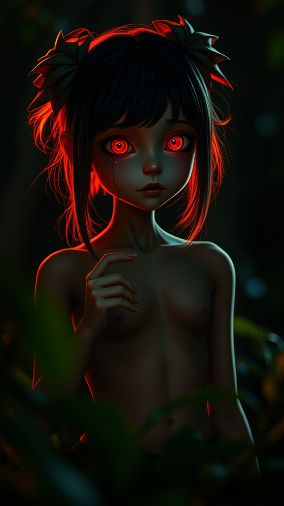 Emerging from the shadows of night, a solitary girl combines the essence of plant and monster, her eyes glowing a vivid red. Her skin is richly colored, hair styled in an elegant, two-side-up fashion. She stands confidently, her navel subtly visible. The scene is captured in sharp focus, with a stunning depth of field and beautiful bokeh effect, all rendered in 8k UHD HDR for vivid clarity. A hint of mutation subtly alters her form, with a long neck and unusually dexterous hands. The image retains its mystique, free from distractions like low resolution, out-of-frame elements, blur, or digital imperfections.