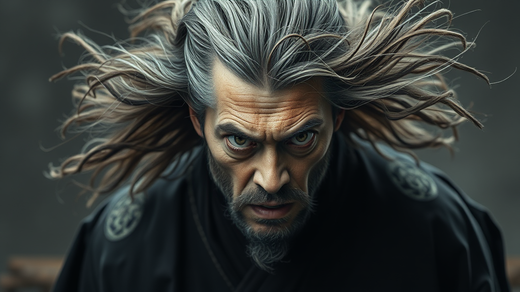 Emerging from the shadowy realm, his hair caught in a turbulent breeze, each strand remarkably detailed. His garments are adorned with complex, traditional symbols, woven intricately into the fabric. His large, expressive eyes convey a profound sense of dread, captured with hyper-realistic detail. Photographed using an H6D-400c Multi-shot with a Mitakon Speedmaster 65mm f/1.4 XCD lens, the scene is illuminated with Fresnel lighting, enhancing every subtle nuance.