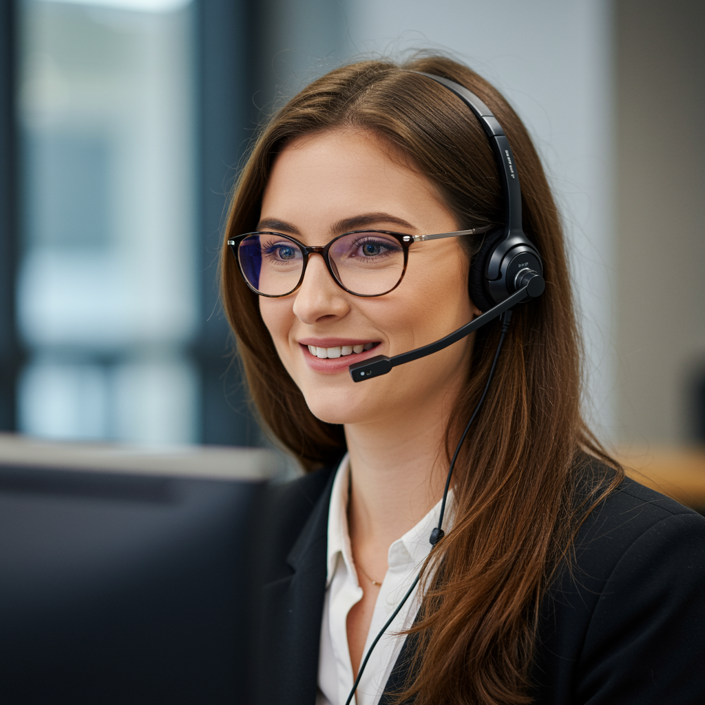 Emily, a dedicated customer care specialist, exudes a calming presence that instantly reassures customers. Her stylish, dark-rimmed glasses enhance her sharp and attentive eyes, giving her an air of keen intelligence. Her chestnut brown hair cascades down her shoulders, with a few strands tastefully tucked behind her ears, allowing the narrative of her sleek headset to take center stage. This advanced device, equipped with a noise-canceling microphone, guarantees her conversations are always clear and effective. Emily's genuine smile reflects her innate empathy, making her the perfect person to handle any customer inquiry with grace and understanding.