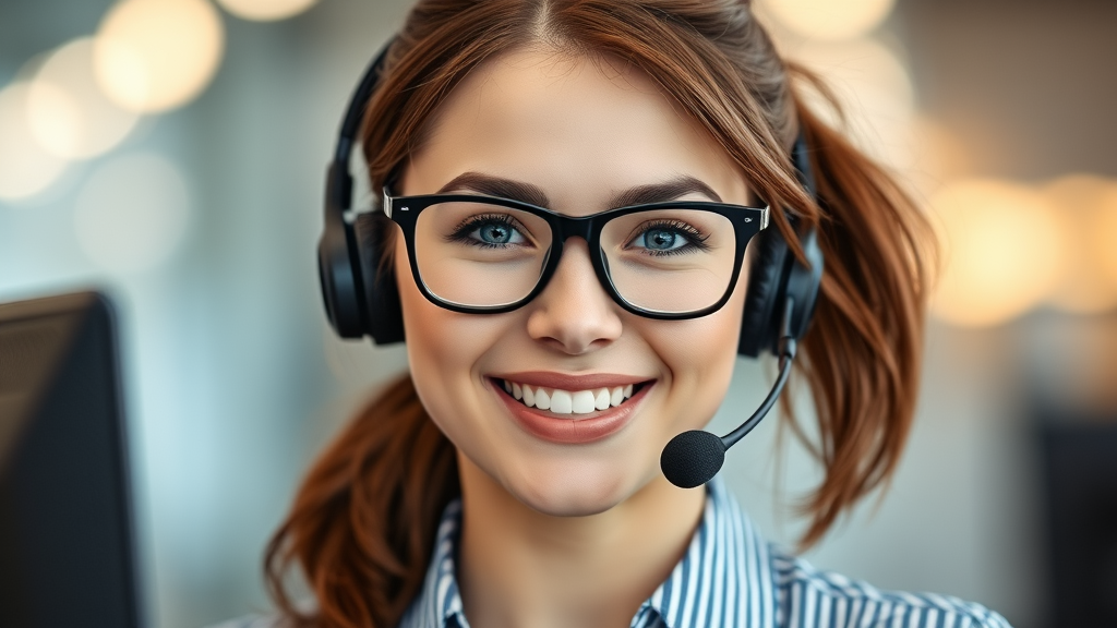 Emily, a dedicated customer service professional, exudes a comforting and approachable demeanor that instantly reassures clients. Her chic, rectangular glasses highlight her focused and insightful expressions. With her medium-length chestnut hair elegantly tied back in a no-nonsense ponytail, she flaunts a state-of-the-art headset, complete with a top-notch noise-canceling microphone that guarantees flawless communication. Her warm smile continually reflects her compassionate nature, solidifying her role as the perfect ambassador for customer service engagements.
