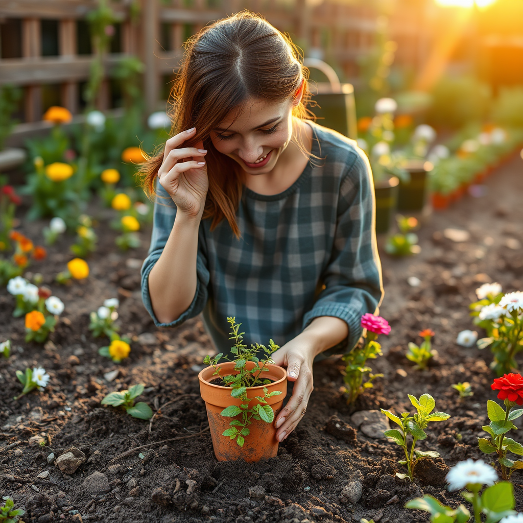 Emily carefully nestled the small terracotta pot into the soft earth of her vibrant garden, the rich scent of soil mingling with the perfume of blooming flowers. She stepped back, brushing a stray lock of hair from her face, her hands smudged with dark, earthy fingerprints. With a deep, satisfied sigh, she admired her handiwork as golden rays of the setting sun cast a warm glow over the tranquil scene, adding a touch of magic to the emerging life around her.