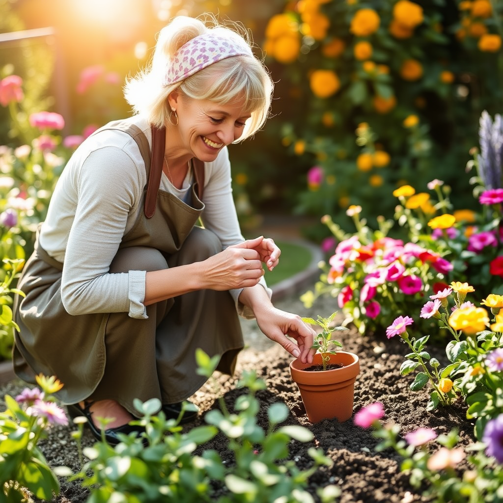 Emily crouches in her vibrant garden, gently patting the soil around a delicate new plant in a small terracotta pot. As she finishes, she stands back and brushes her hands against her apron, a serene smile spreading across her face. The sun casts a warm glow over her as she admires the fresh addition among the blooms, feeling a deep sense of accomplishment and calm.