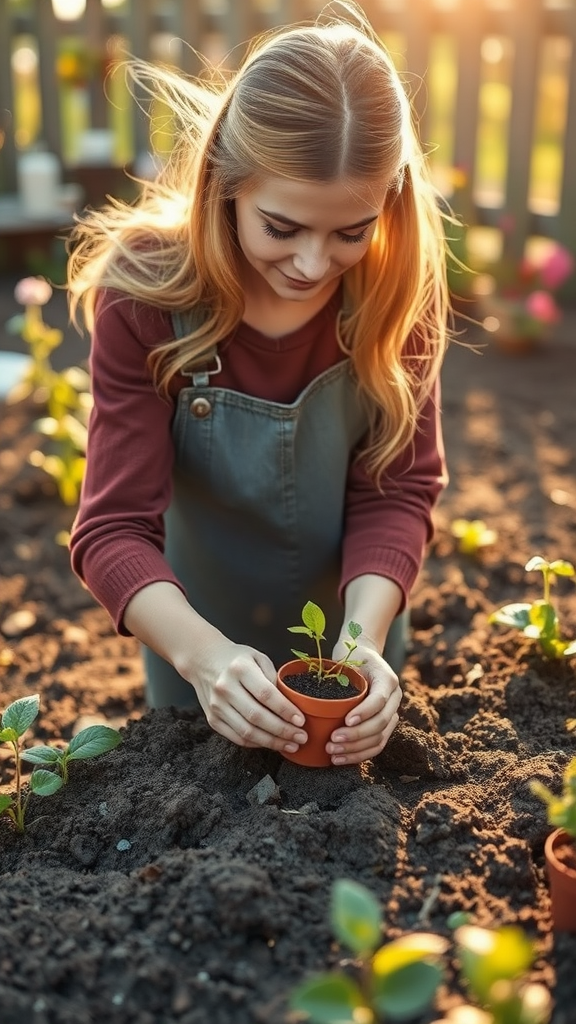 Emily gently placed the tiny pot into the soil of her blossoming garden, her fingers brushing softly against the earth. As she stood back, a contented sigh escaped her lips, the warm sunlight casting a soft glow on her face and illuminating the tender hope in her eyes as she envisioned the growth to come.