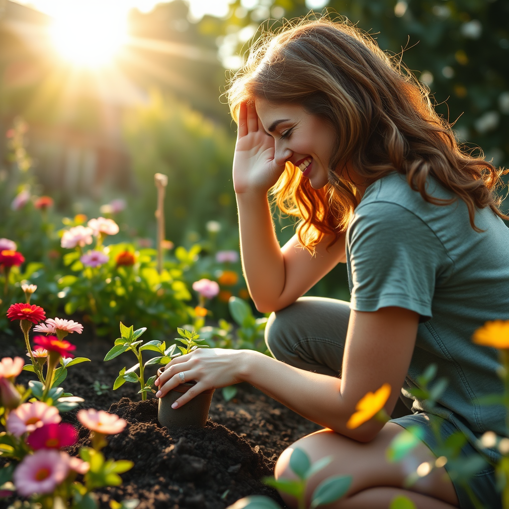Emily kneels in her lush garden, her hands gently pressing the soil around the small pot she's just planted. Her fingers are stained with earth, a testament to her labor and love for her plants. She stands back, wiping her brow with the back of her hand, letting out a contented sigh as she admires her work. The sun casts a warm, golden glow over the garden, highlighting the vibrant colors of the blooming flowers around her. A gentle breeze rustles the leaves, carrying the sweet scent of freshly turned earth. Emily smiles, feeling a deep connection to the nature she has lovingly nurtured.