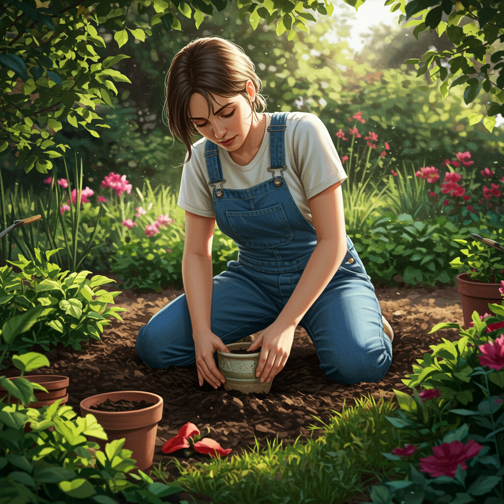 Emily knelt down in her vibrant garden, her fingers gently pressing the moist earth around the small ceramic pot she had just planted. The sunlight dappled through the leaves above, casting playful shadows on her focused face as the scent of fresh soil filled the air. After a few thoughtful adjustments to ensure the pot was secure, she stood up and brushed her hands against her denim overalls, leaving faint smudges. Taking a step back, she let out a deep sigh of contentment, watching the pot nestled among blooming flowers and thriving greenery, feeling a sense of calm accomplishment sweep over her.