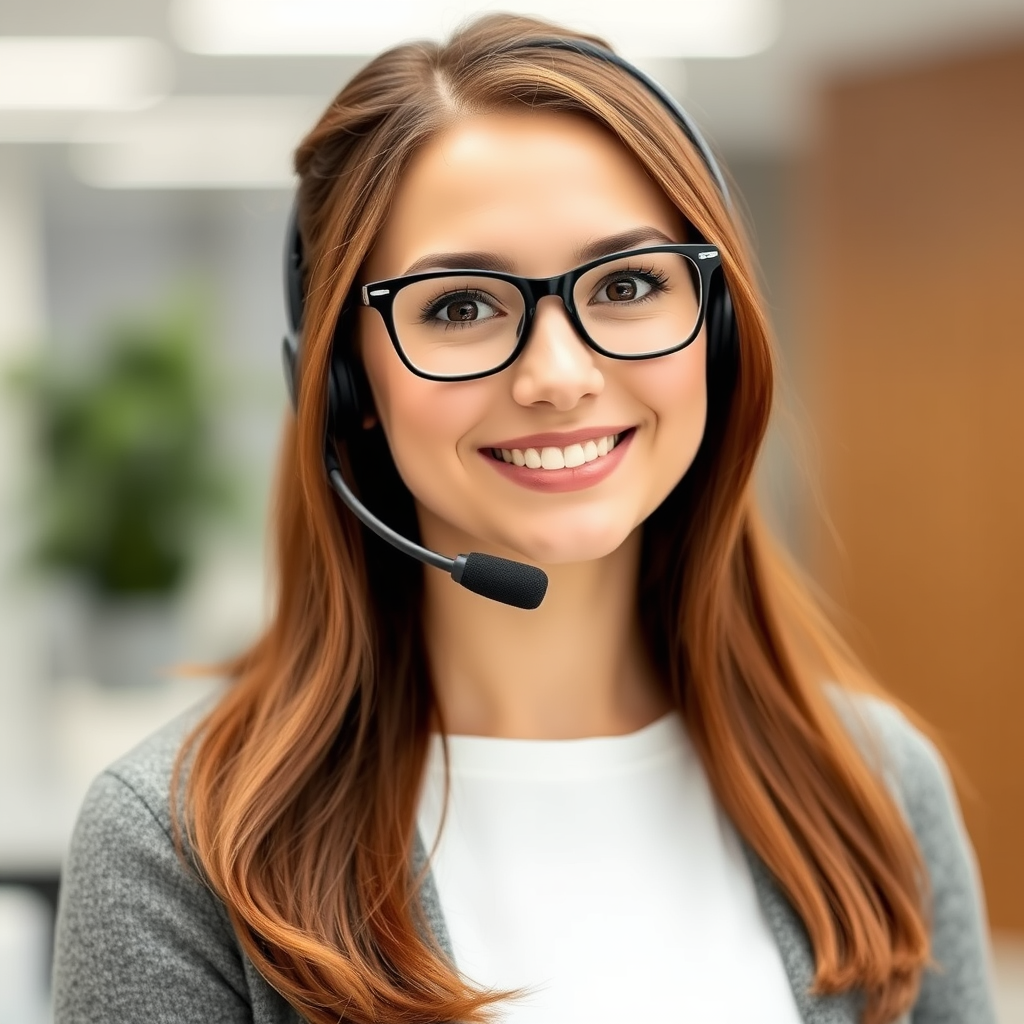 Emily, the customer care specialist, exudes a comforting and approachable aura that instantly reassures customers. Her elegant, black-framed glasses highlight her perceptive and thoughtful eyes. With shoulder-length chestnut hair, she chooses a tidy bun for a polished look, which complements her high-tech headset equipped with a crisp-sounding microphone for seamless communication. Her genuine smile is ever-present, reflecting her compassionate disposition, making her an exemplary figure in any customer service scenario.