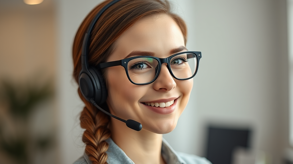 Emily, the customer care specialist, exudes a warm and inviting presence that immediately puts customers at ease. She sports chic, black-rimmed glasses that highlight her attentive and intelligent expression. Her medium-length chestnut hair is elegantly styled into a neat braid, showcasing a state-of-the-art headset equipped with a high-performance noise-canceling microphone, ensuring crystal-clear communication. Emily's genuine smile reflects her caring and empathetic demeanor, making her the perfect representative for any customer service engagement, hyper-realistic photography, 8k, softly diffused lighting, portrait orientation, high style parameter.