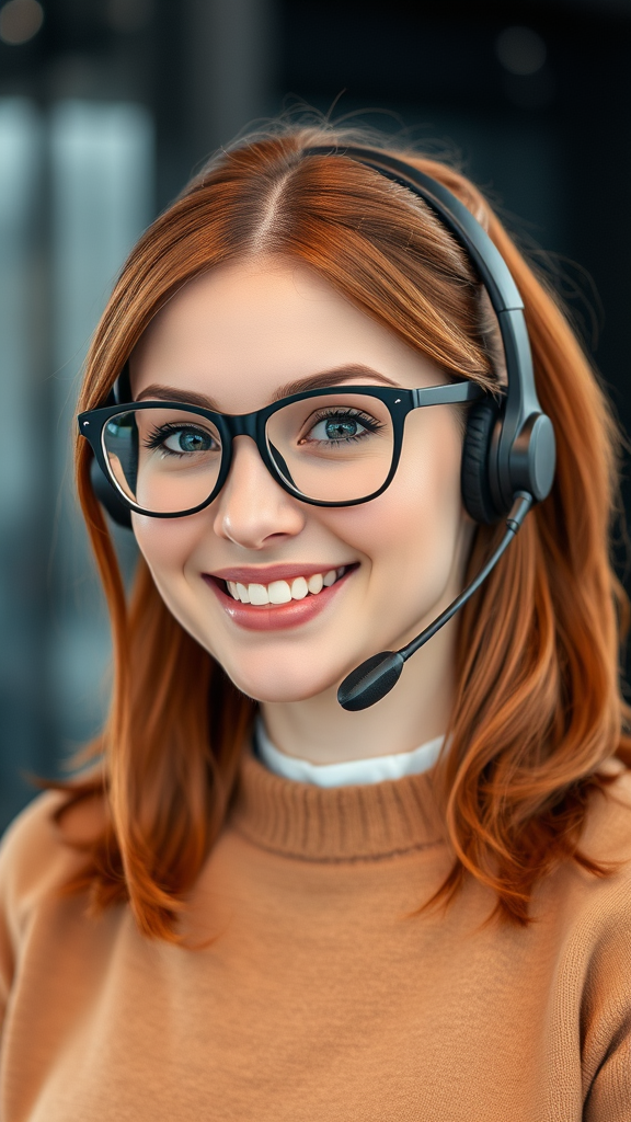 Emily, the customer care specialist, exudes a warmth that immediately puts customers at ease. Her chic, black-framed glasses highlight her attentive and insightful gaze, while her shoulder-length auburn hair is elegantly tied back in a polished ponytail. This style perfectly showcases a sleek headset equipped with a high-quality microphone, ensuring impeccable communication with each customer. Emily's genuine smile speaks volumes of her compassionate nature, making her a perfect fit for any customer service role.
