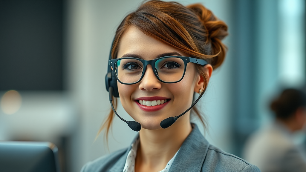 Emily, the customer service expert, exudes a comforting professionalism that instantly reassures clients. She dons modern, matte grey-framed glasses that highlight her focused and knowledgeable gaze. Her shoulder-length chestnut hair is elegantly tied back in a sleek bun, revealing a contemporary headset equipped with high-definition sound technology for impeccable communication clarity. Emily's genuine smile radiates her understanding and caring nature, making her an exemplary figure for any customer service situation, hyper-realistic photography, 8k, soft ambient lighting.