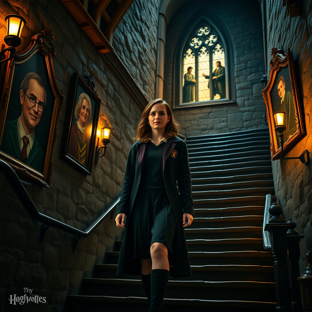 Emma Watson, dressed in a Hogwarts school uniform, wanders through the mysterious halls of Hogwarts. The ancient stone walls echo with the whispers of past students, and the flickering torchlight casts playful shadows. As she walks past the enchanted portraits, the characters within smile and wave, recognizing the familiar face of Hermione Granger. Emma stops at the grand staircase, marveling at the shifting steps and the magic in the air, feeling both herself and part of the legendary story.
