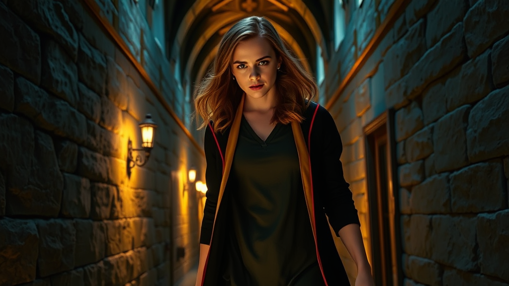 Emma Watson gracefully navigates the enchanting hallways of Hogwarts, her Hogwarts school uniform blending seamlessly with the magical surroundings. Her vibrant curiosity reflects the ancient wisdom etched into the castle's stone walls. As she moves through the corridors, the flickering torchlight casts intriguing shadows, highlighting the air of mystery that envelops her. The enchanted air buzzes subtly with the whispers of past wizards, echoing her innate connection to the world of magic and wonder.