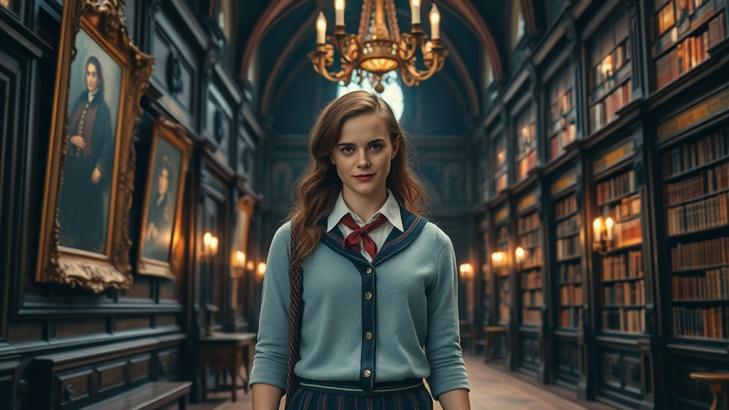 Emma Watson, in a vintage-style Hogwarts school uniform, wanders through the echoing corridors of the castle, her curious eyes taking in the enchanted moving portraits and the flickering candle-lit chandeliers above. As she steps into the grand library, the scent of aged parchment and the whisper of turning pages surround her, blending the charm of magic with her confident grace.