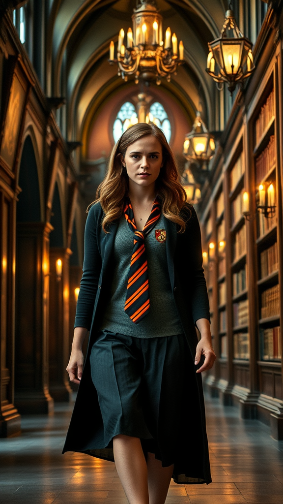 Emma Watson wanders the magical corridors of Hogwarts, her Hogwarts school uniform merging seamlessly with the enchanted atmosphere around her. With each step, her Gryffindor tie sways gently, echoing the portraits' soft whispers as they follow her graceful movements. The glow of candlelight from floating chandeliers casts a warm hue on her familiar, determined face, capturing the essence of Hermione Granger's intelligence and courage in every stride. Dust motes dance in the air as she pauses at the entrance of the grand library, the air rich with the scent of aged parchment and ancient spells, calling to her curious nature.