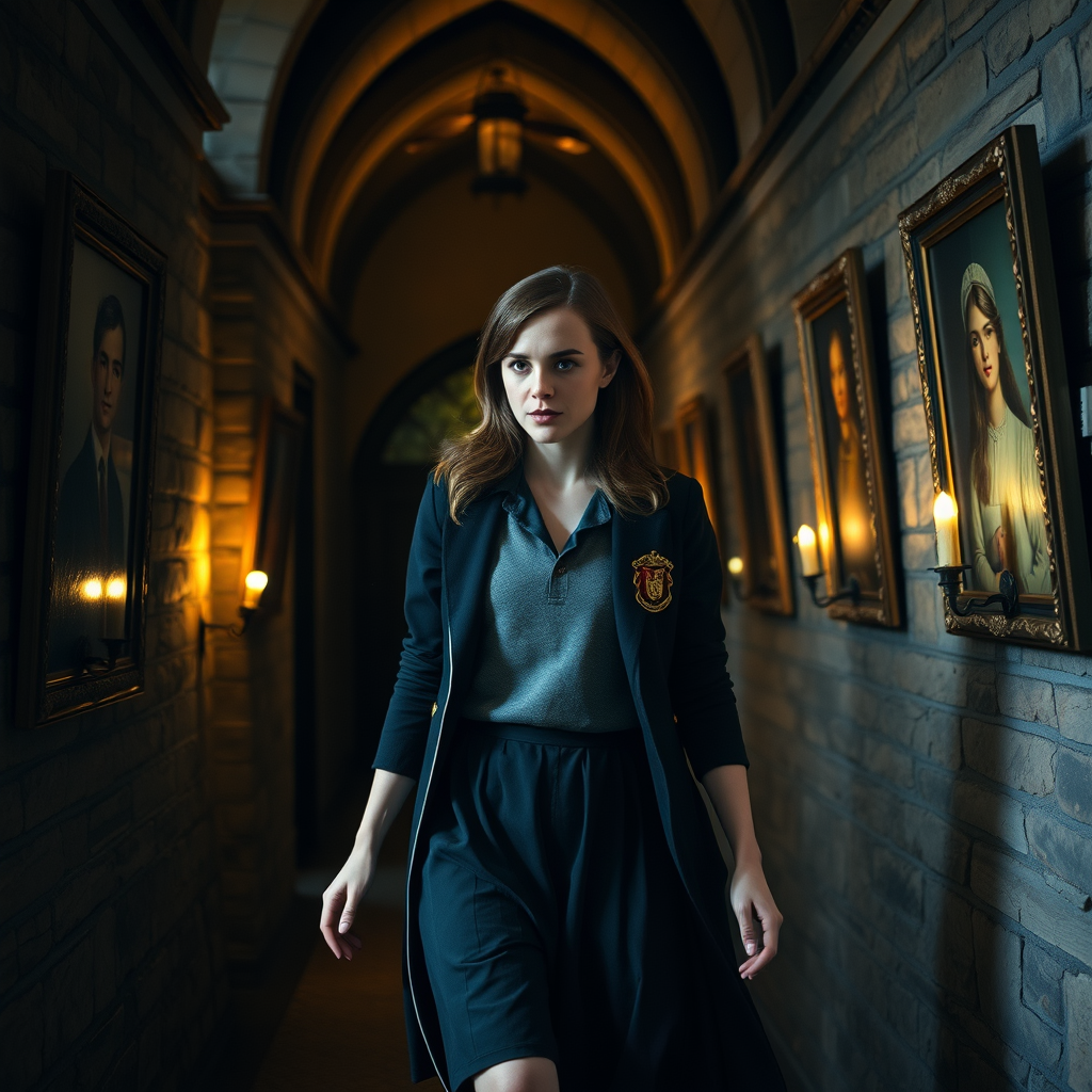 Emma Watson, wearing a classic Hogwarts school uniform, explores the enchanting corridors of the castle with a sense of nostalgia. The flickering candlelight casts playful shadows on the stone walls, and the soft whispers of ancient portraits follow her as she glides gracefully past them. Her genuine curiosity and admiration for the magical world around her seem to transform the familiar surroundings into something altogether new and wondrous.
