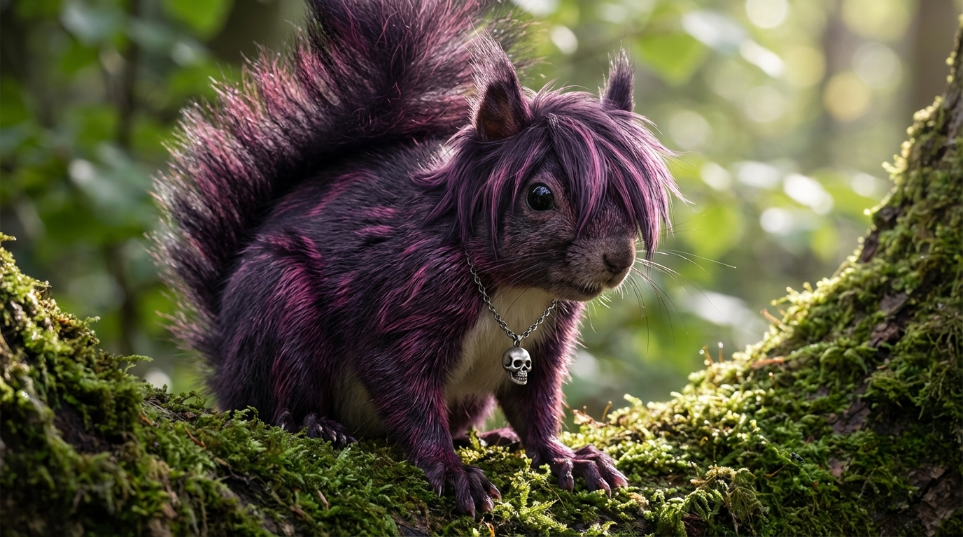 Photorealistic close-up of a squirrel with an emo hairstyle, sitting on a mossy tree branch. The squirrel has dark purple and pink streaked hair covering its eyes, and wears a silver chain necklace with a skull pendant. Natural lighting, soft bokeh background with green leaves. Focus on intricate fur details and hair texture. Atmospheric, slightly humorous, vibrant colors.