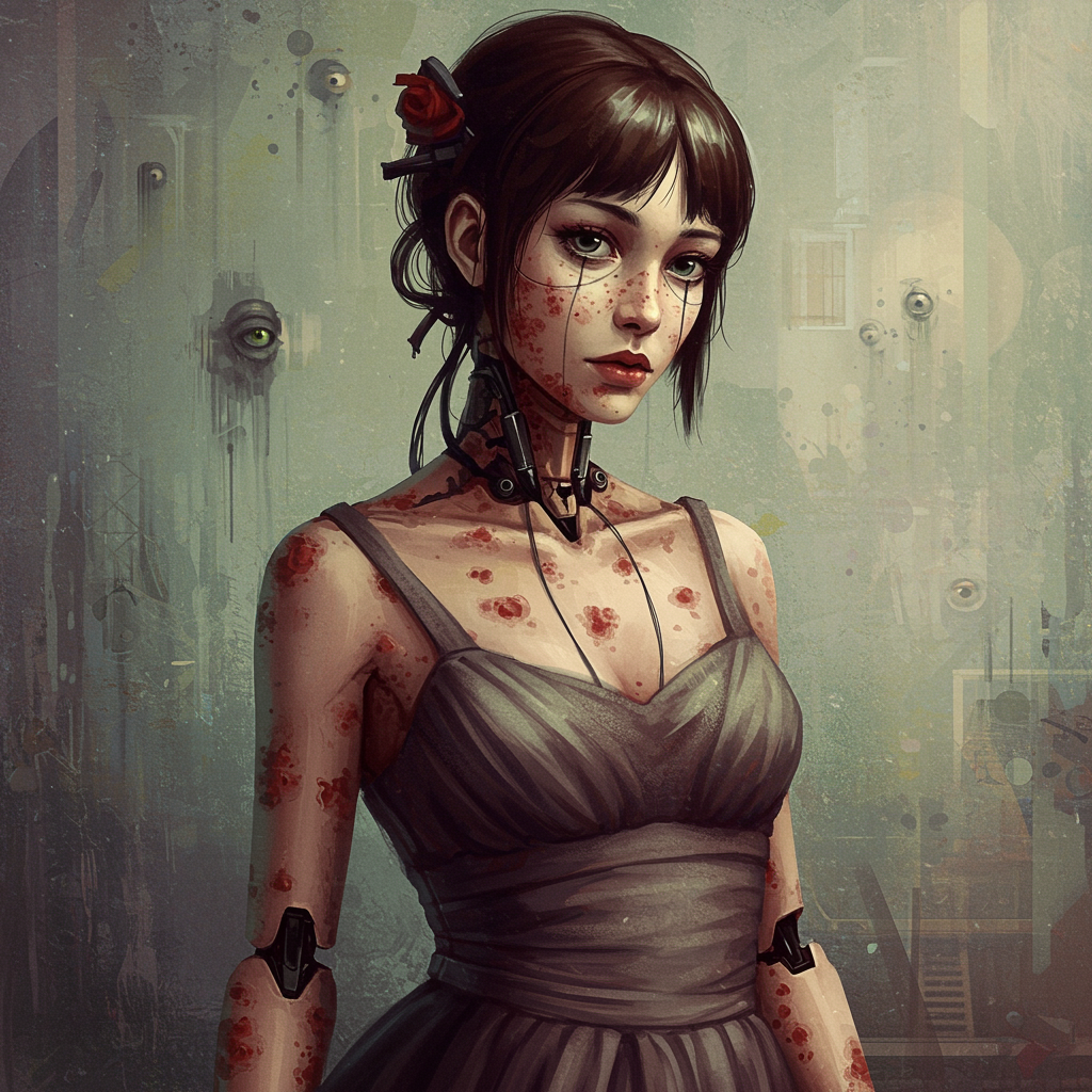 Emotional cyborg girl adorned in an elegant dress, her presence a blend of machinery and humanity, with skin lesions artistically narrating her story. Set within a dreamlike atmosphere, this mixed media artwork embraces surrealist expressionism; abstract and distorted forms evoke layers of emotion. A muted color scheme enhances the ethereal quality, blurring the lines between reality and imagination.