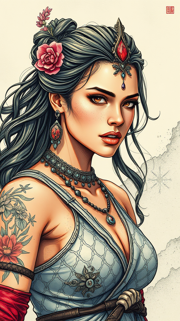 Empowered warrior princess, poised with grace, intricate and highly detailed key visual showcasing breathtaking beauty, featuring precise linework and vibrant colors, evoking a comprehensive cinematic essence, inspired by the styles of Carne Griffiths and Conrad Roset.