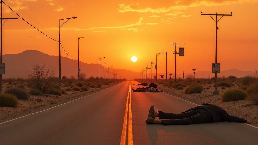 Empty streets stretch under a sky painted with the remnants of an orange sunset, devoid of any human presence, where only the wind whispers past rows of starkly upright, hollow suits, mimicking life as they lay strewn horizontally across the barren landscape.