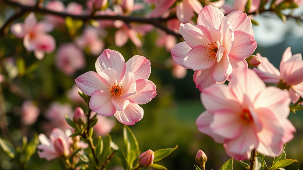 En un jardín tranquilo al romper el alba, las flores deslumbran con sus delicados pétalos danzantes de tonos rosados y blancos. La suavidad y complejidad de sus texturas embellecen el paisaje mientras la luz matutina ilumina cada detalle. La armonía de las flores y el juego de colores crean un paisaje vibrante y sereno.